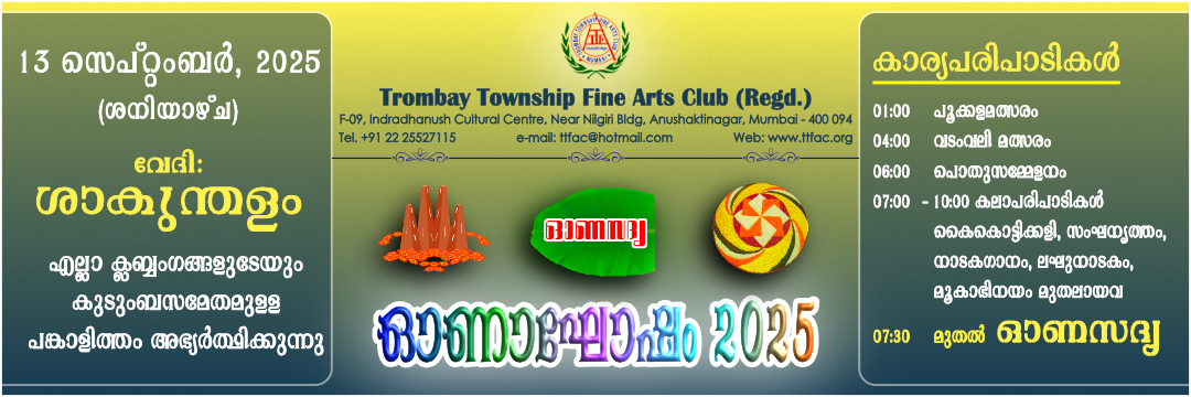 TTFAC is celebrating ONAM on Saturday, 13-9-2025, 6:00 pm at SHAKUNTALAM Auditorium with traditional ONASADHYA and various cultural programs. All are Welcome