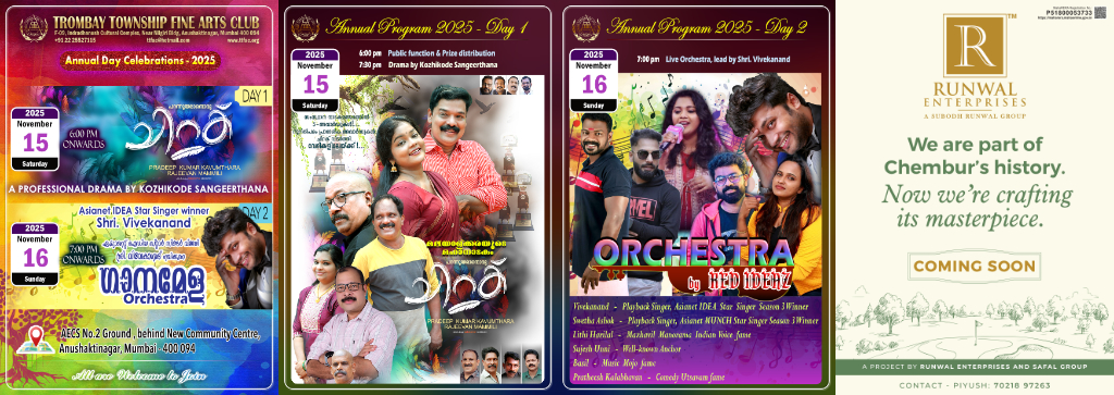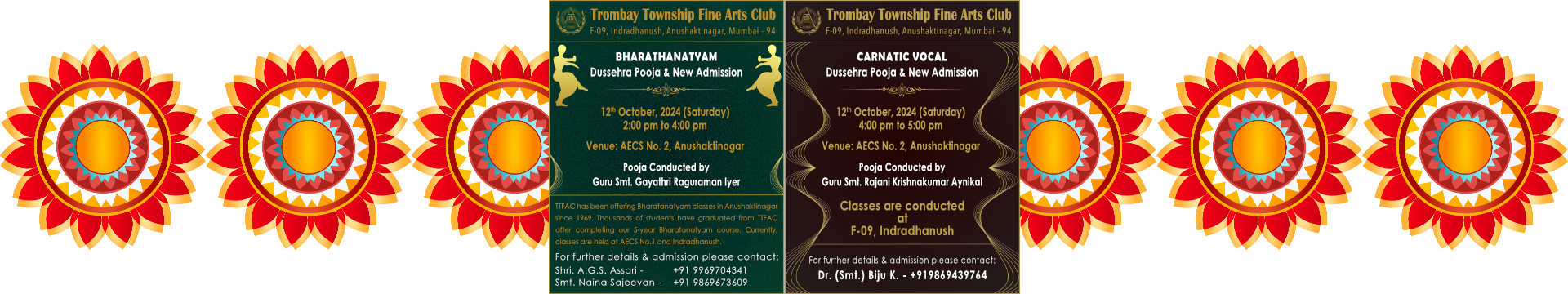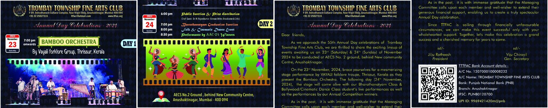 As we approach the 55th Annual Day celebrations of Trombay Township Fine Arts Club, we are thrilled to share the exciting lineup of events awaiting us on 23rd (Saturday) & 24th (Sunday) of November 2024 to be conducted at AECS No. 2 ground, behind New community Centre, Anushaktinagar.